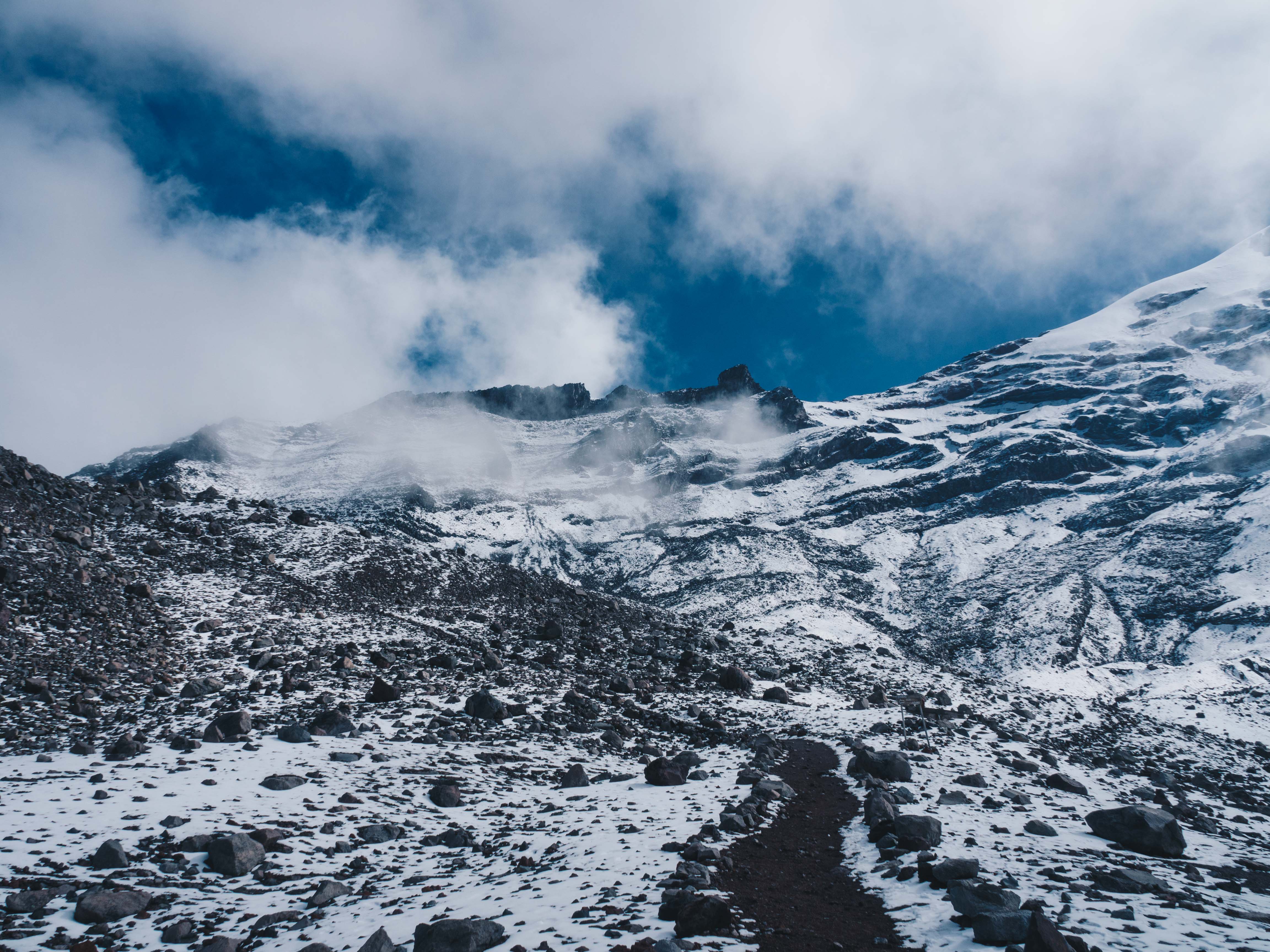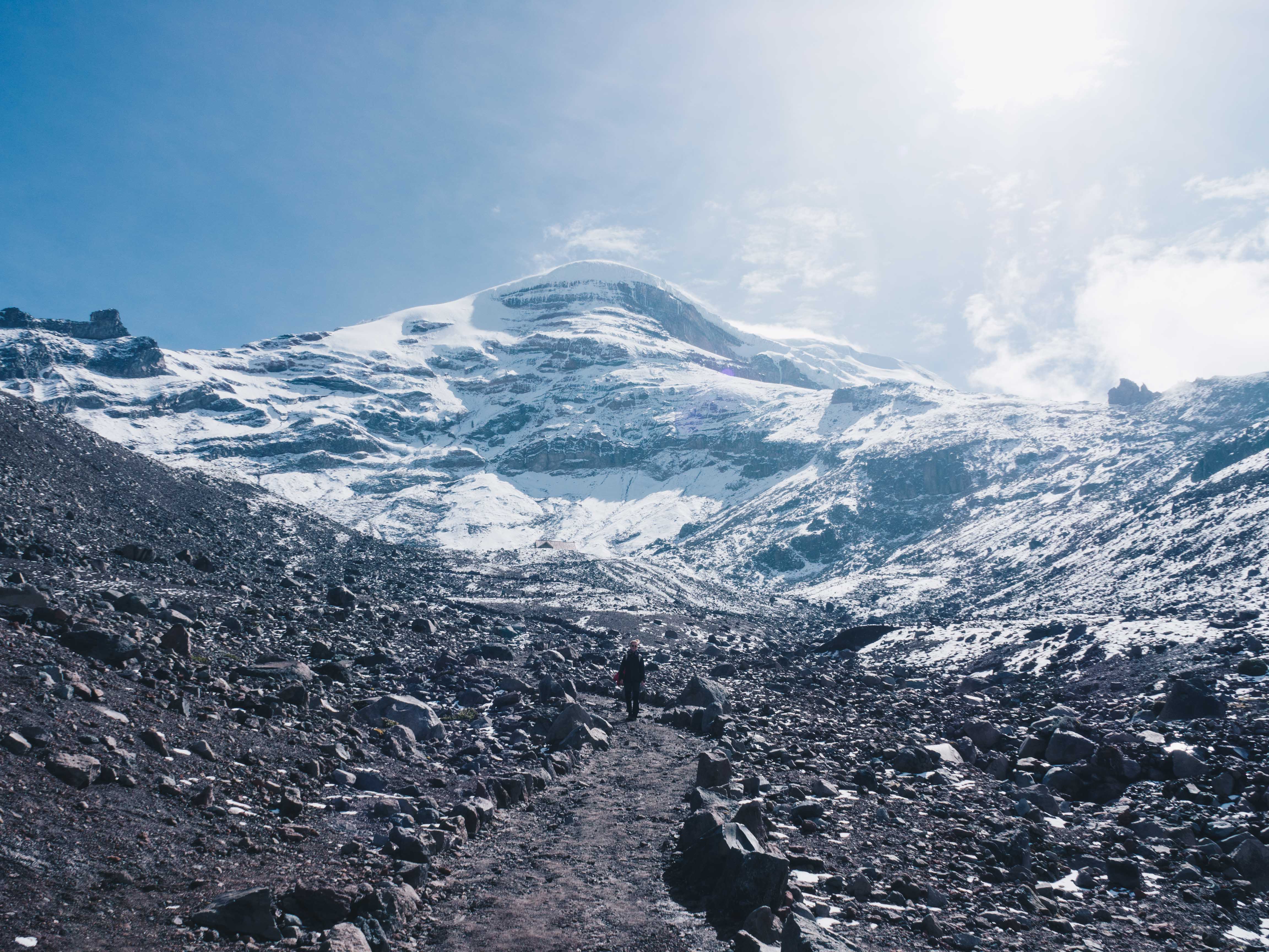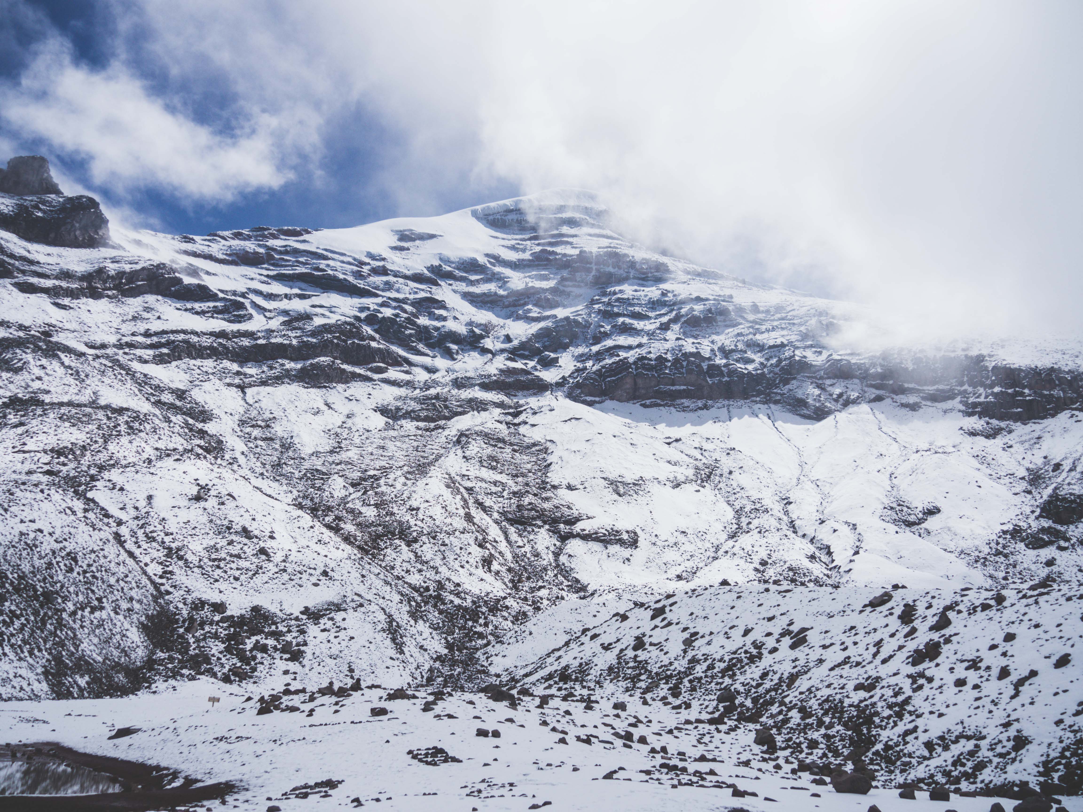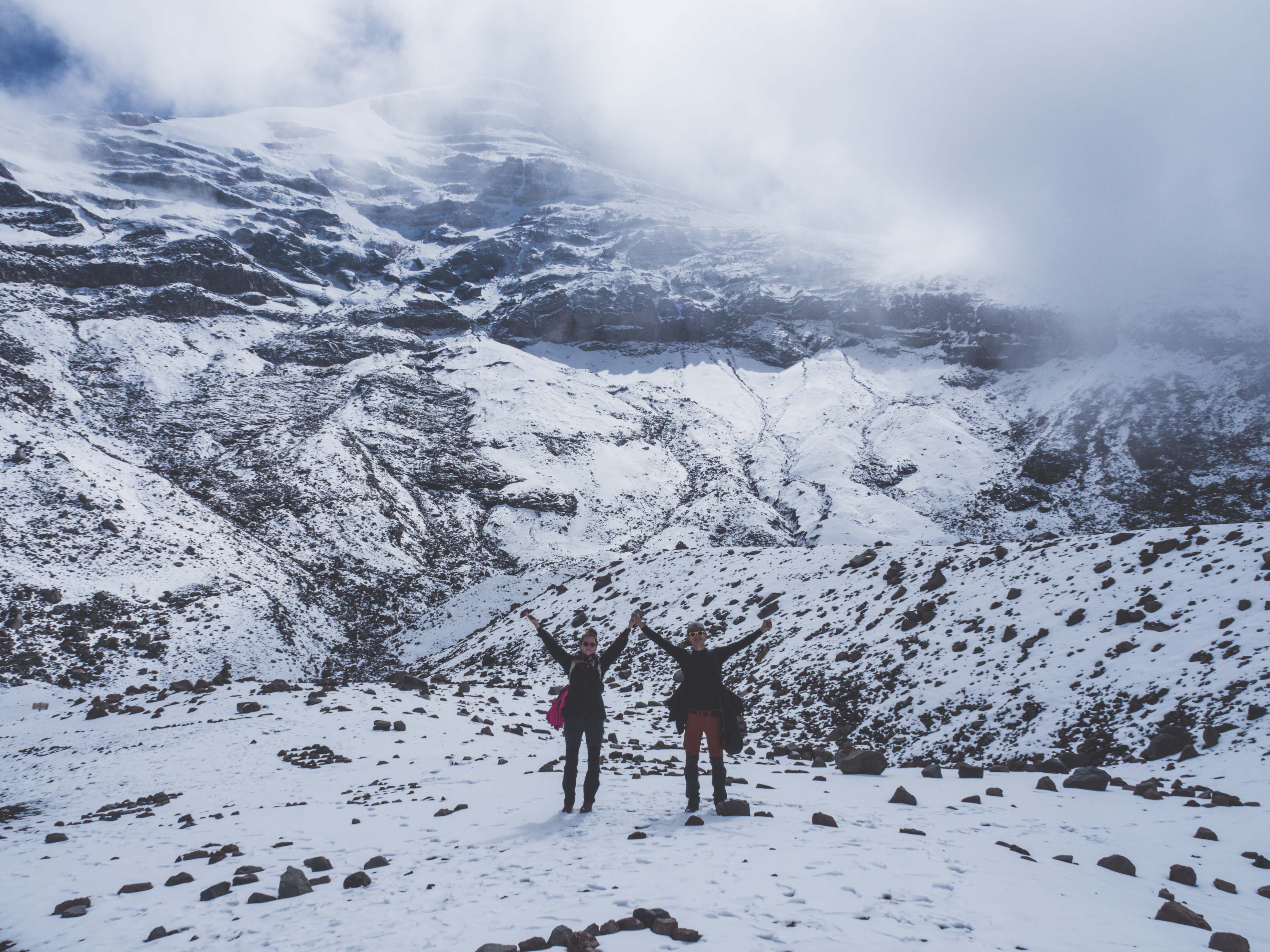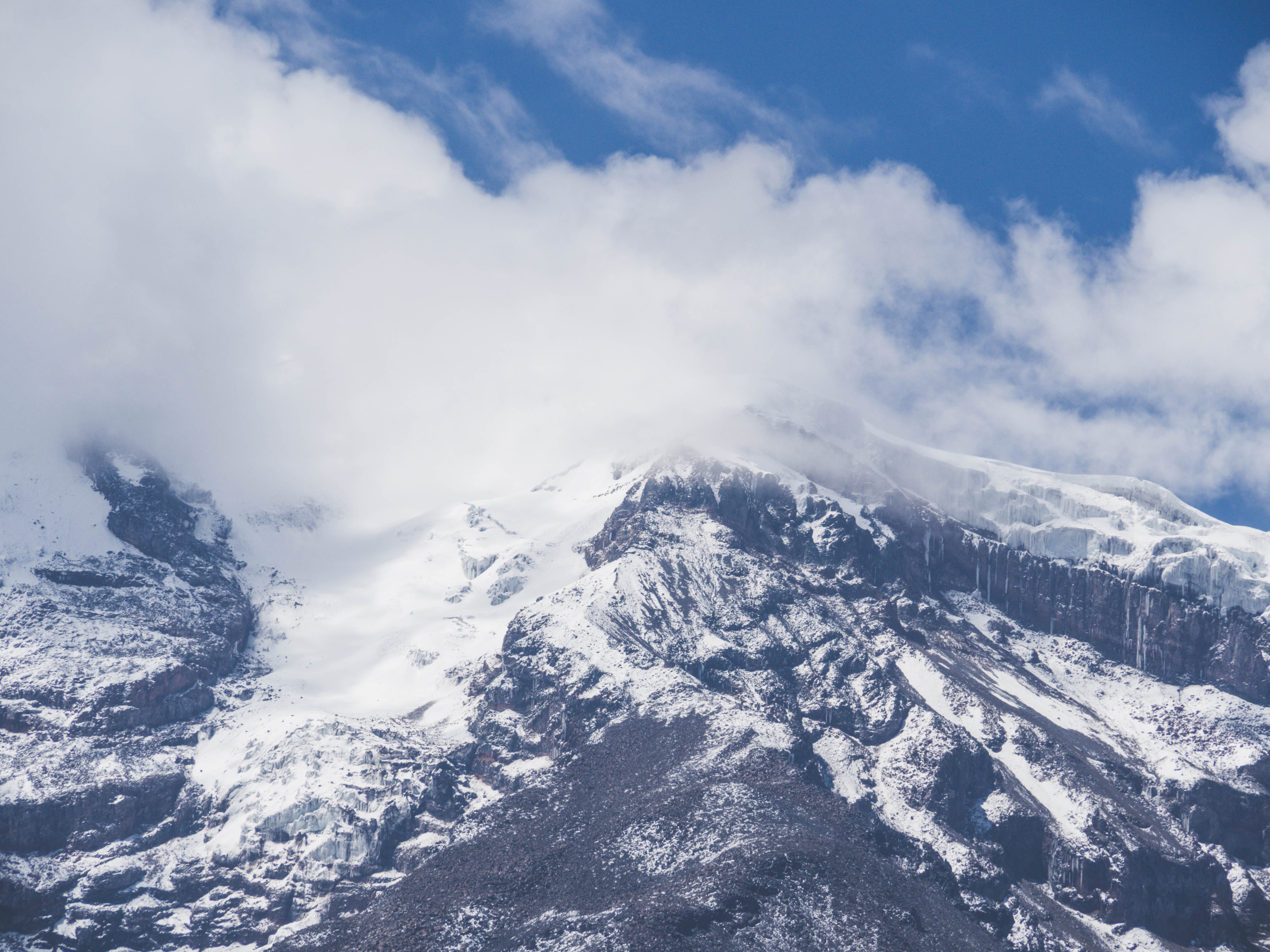 On débute l’ascension à partir du parking à 4,800 mètres pour atteindre le refuge à 5,000 mètres tout d’abord. Un mal de tête et oreilles est présent pour tous les deux alors qu’au Népal nous n’avions connu aucun mal de l’altitude, on est clairement montés trop vite. C’est à bout de souffle que l’on marche dans ce paysage lunaire et qu’on s’approche des neiges éternelles. Arrivés au refuge, on continue pour monter à 5,100 mètres, le Chimborazo joue avec les nuages mais on l’aperçoit tout de même. 20 minutes plus tard, on y est , que c’est beau. Bon on n’a pas le même sentiment d’accomplissement qu’au Népal où il avait fallu marcher 115 kms pour en arriver là contre max 1h ici.