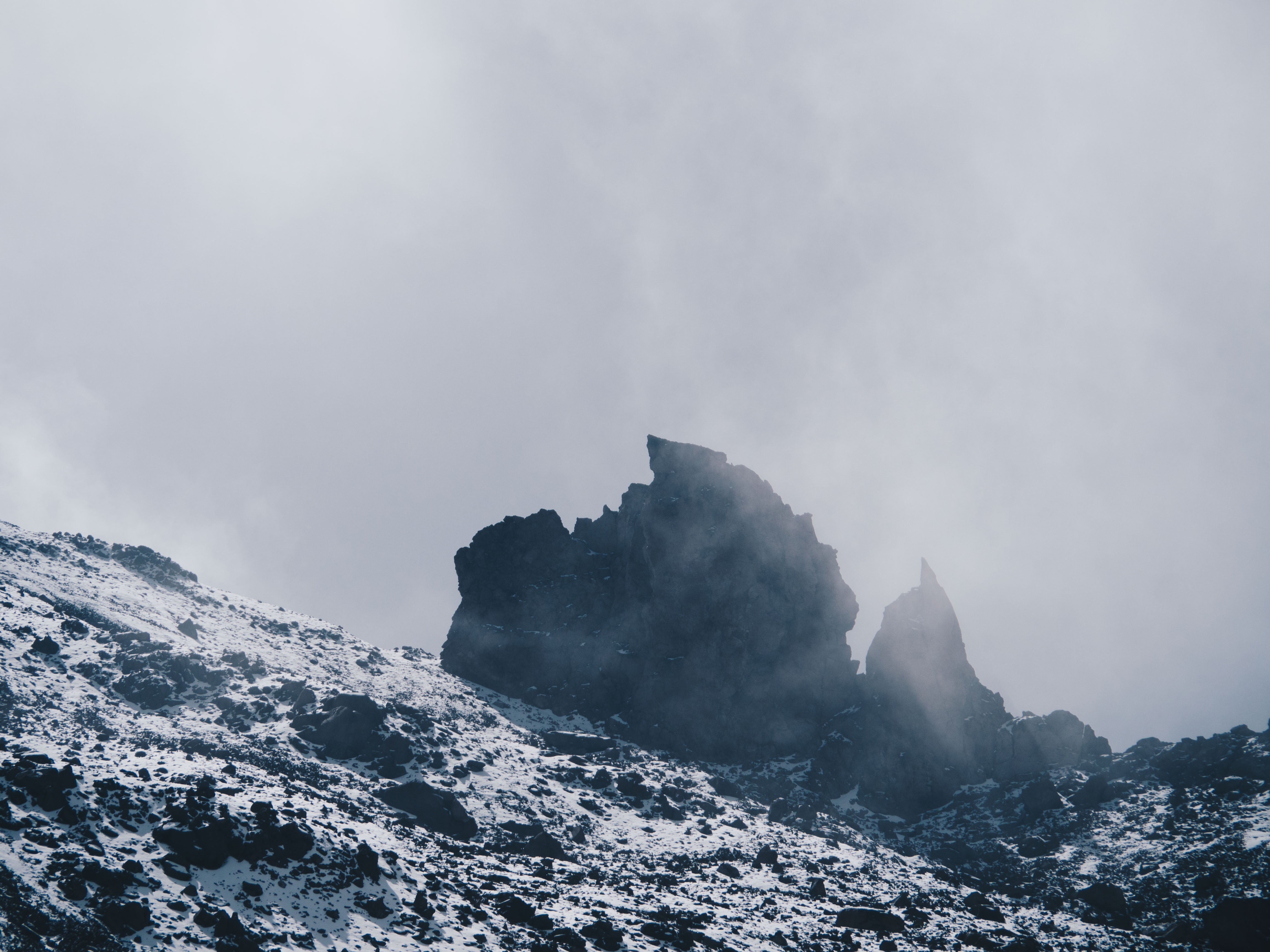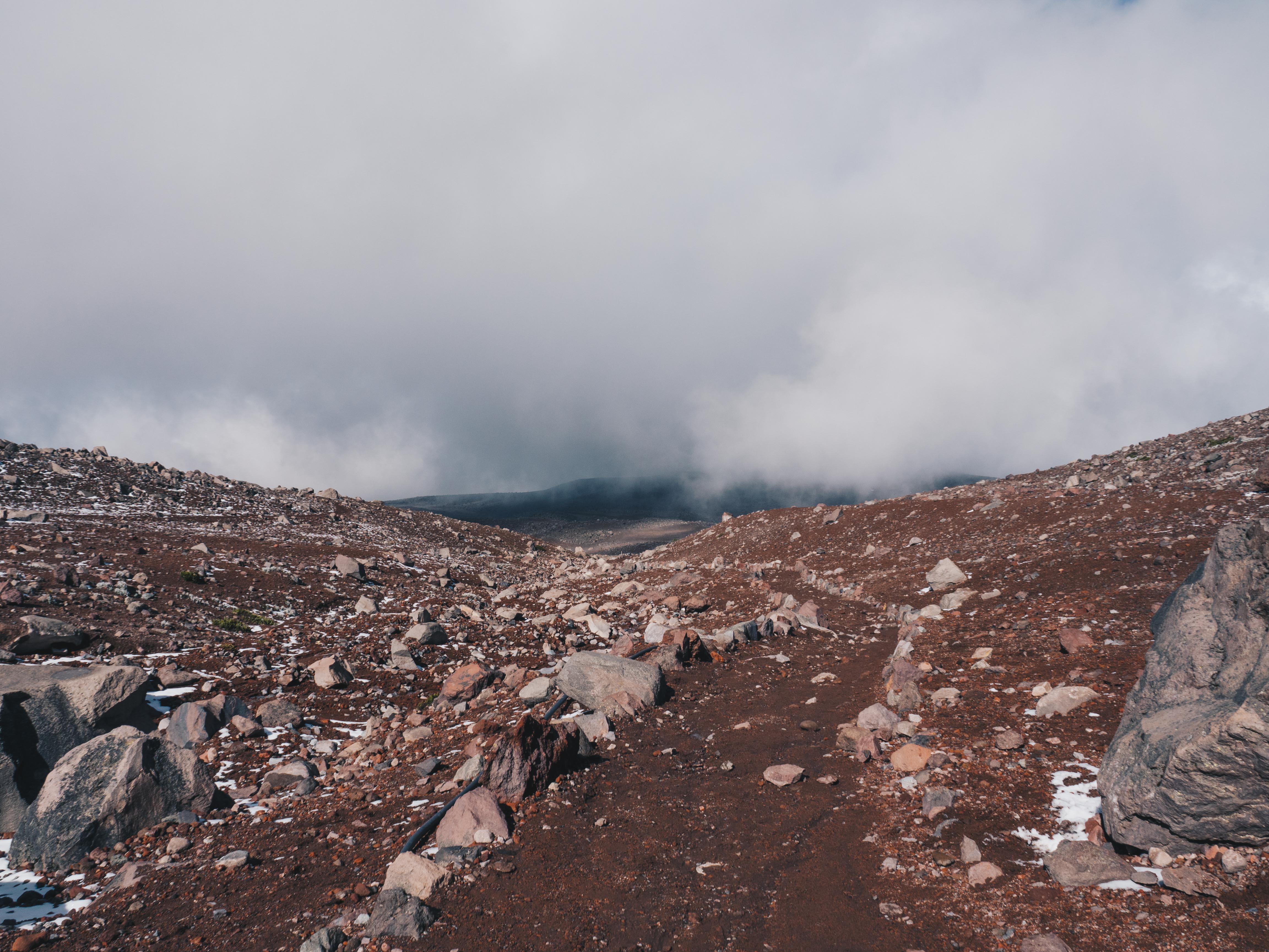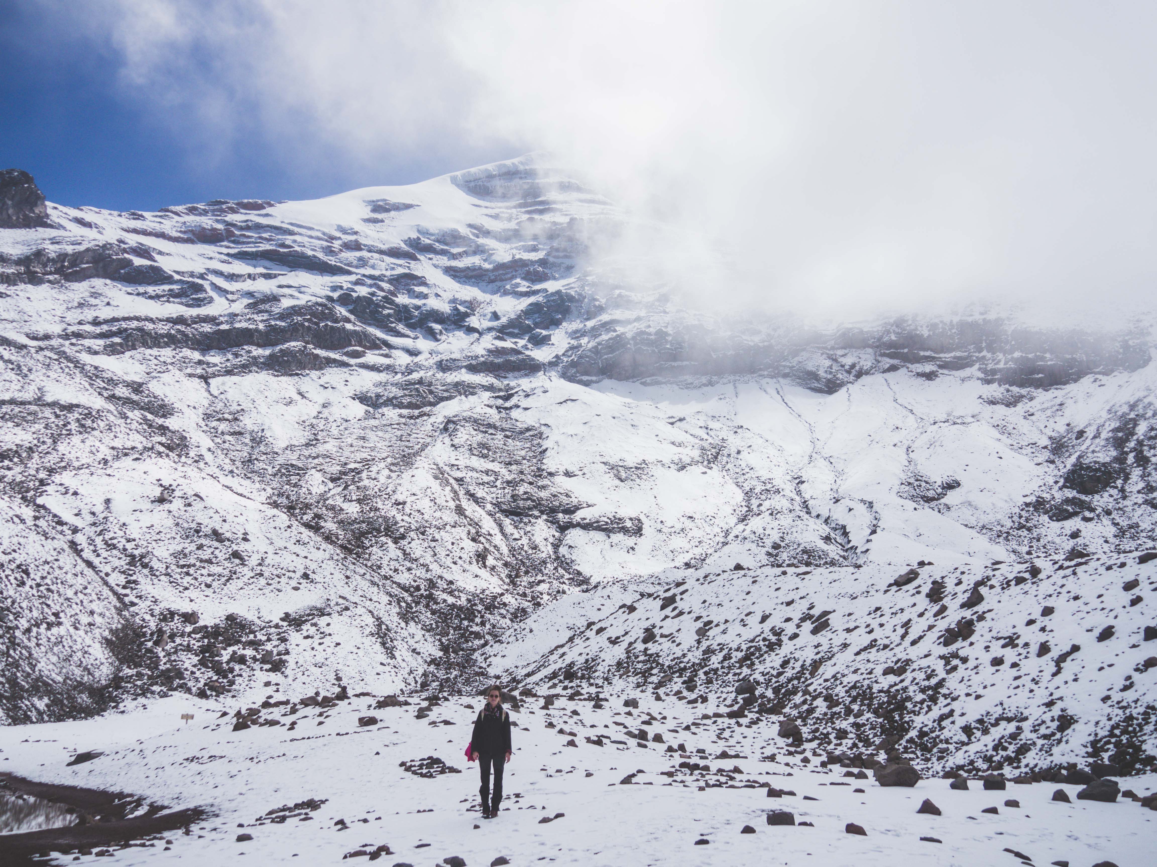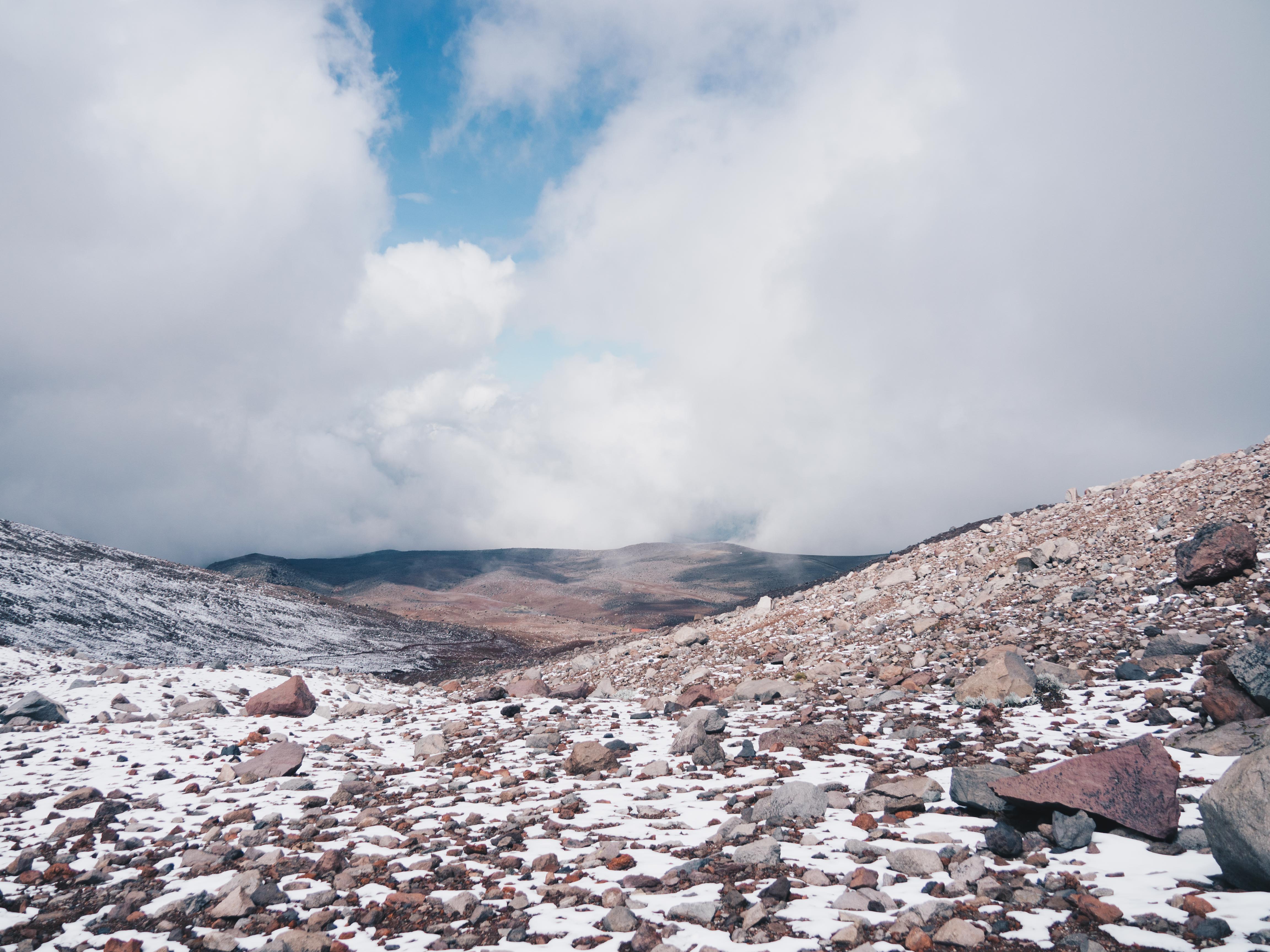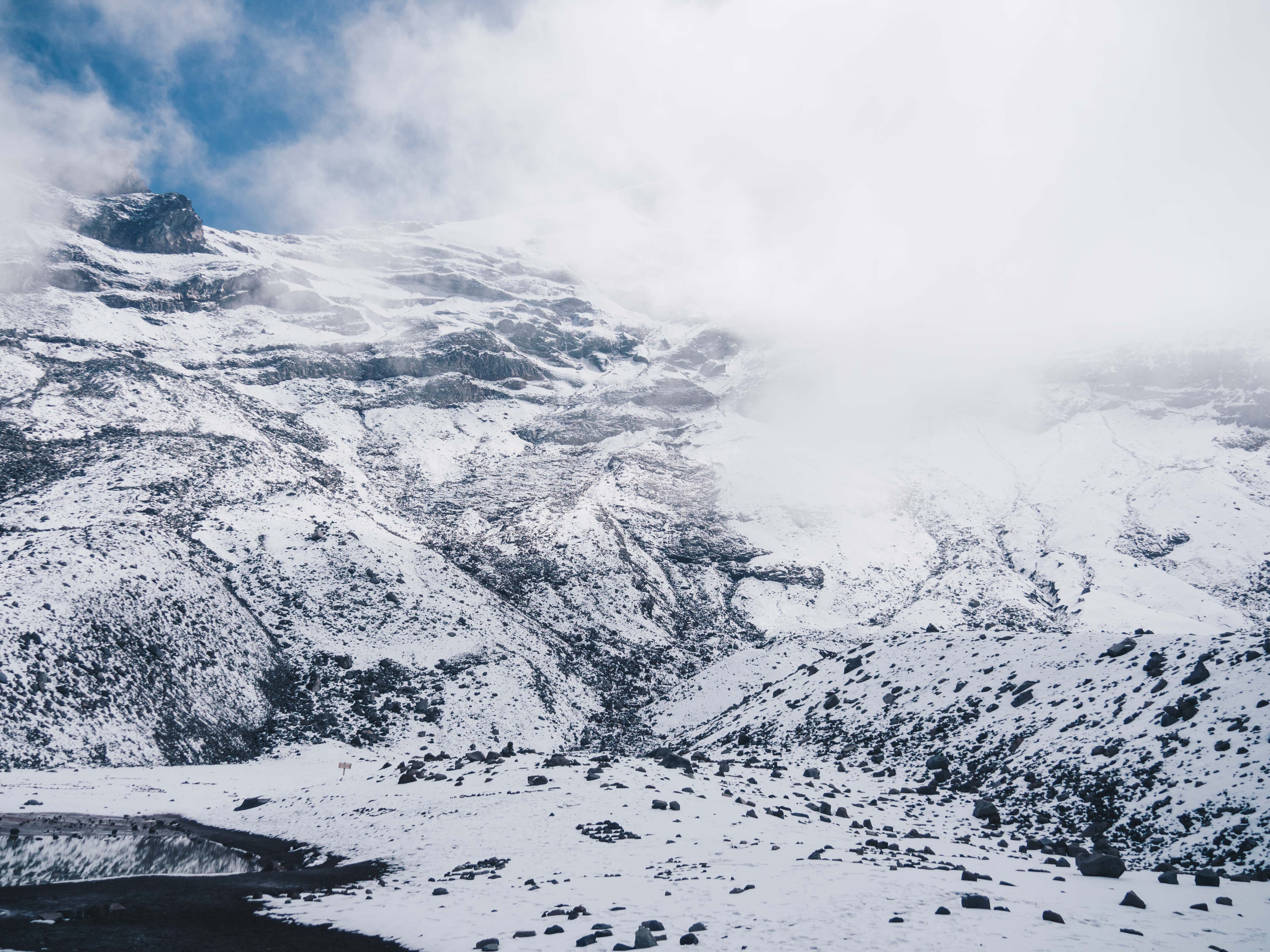 On débute l’ascension à partir du parking à 4,800 mètres pour atteindre le refuge à 5,000 mètres tout d’abord. Un mal de tête et oreilles est présent pour tous les deux alors qu’au Népal nous n’avions connu aucun mal de l’altitude, on est clairement montés trop vite. C’est à bout de souffle que l’on marche dans ce paysage lunaire et qu’on s’approche des neiges éternelles. Arrivés au refuge, on continue pour monter à 5,100 mètres, le Chimborazo joue avec les nuages mais on l’aperçoit tout de même. 20 minutes plus tard, on y est , que c’est beau. Bon on n’a pas le même sentiment d’accomplissement qu’au Népal où il avait fallu marcher 115 kms pour en arriver là contre max 1h ici.