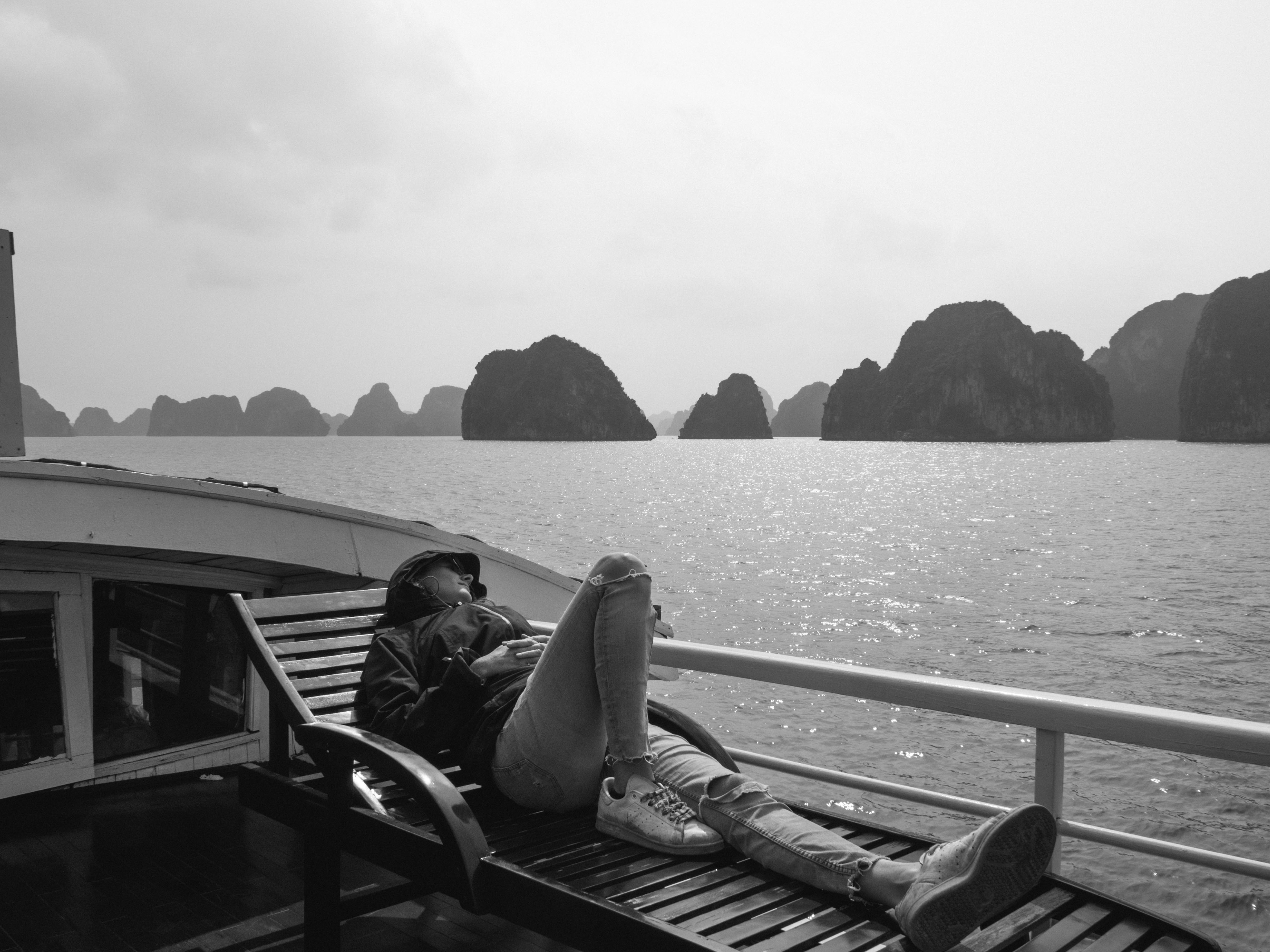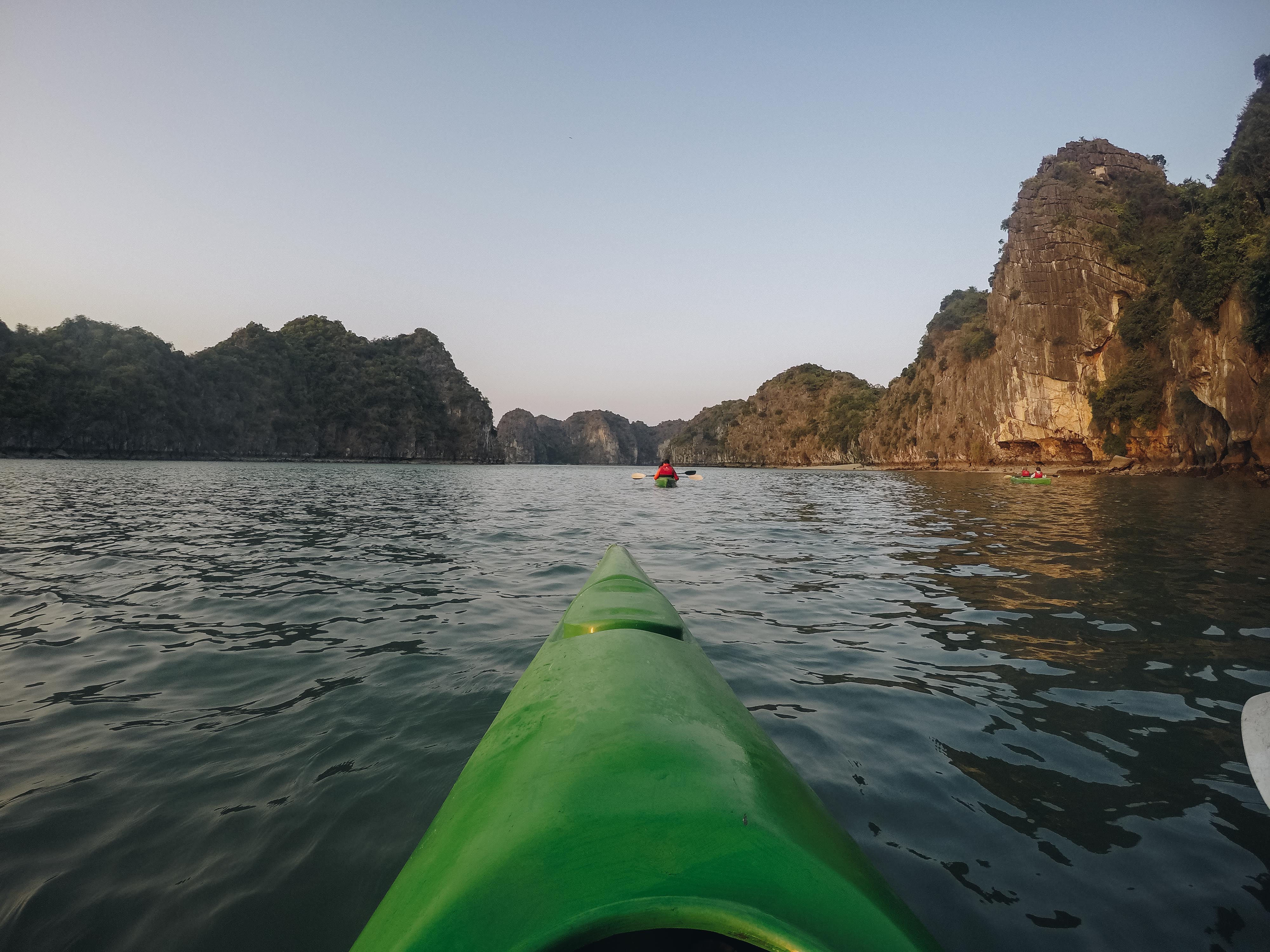 Cédric récupère doucement de sa grippe sur le pont de notre jonque ou dans la cabine tandis que l'on s'adonne au kayak sur la baie si tranquille, au milieu des grottes et des pains de sucre. Nous en visiterons une assez impressionnante.