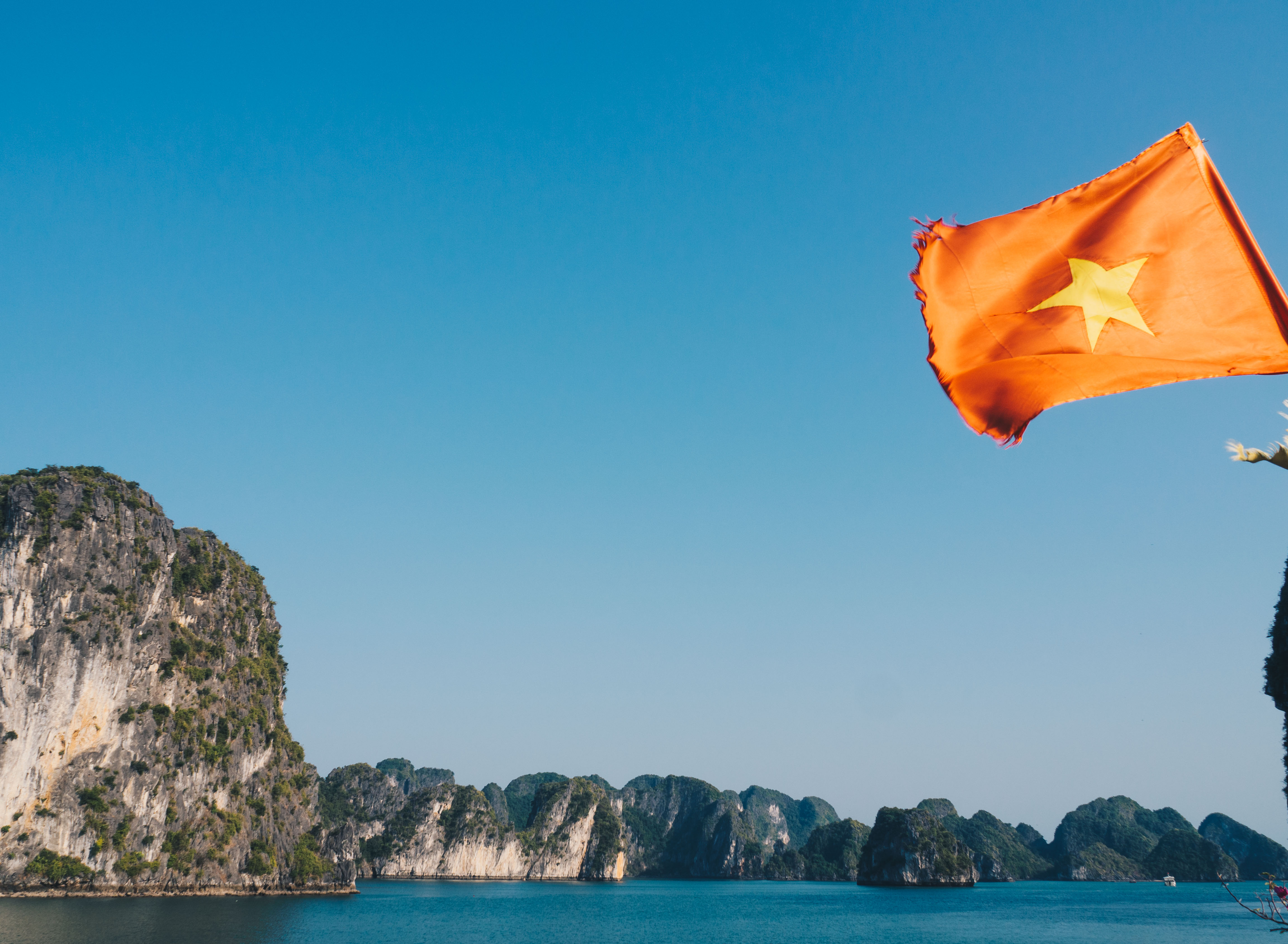 De notre côté pas de dragon en vue (ni de jade d'ailleurs) mais une croisière paisible de 2 jours 2 nuits, où nous voguons entre les pics et les villages de pêcheurs, flottants, posés sur des planches de bois. Le drapeau Vietnamien est omniprésent, la propagande communique à son apogée. Les femmes rament de la même façon que dans la baie d'Halong terrestre: avec les pieds, chapeau pointu sur la tête !